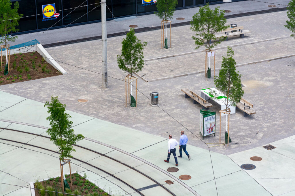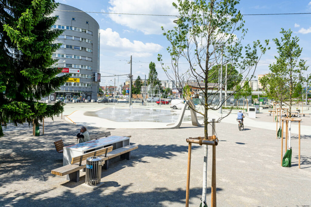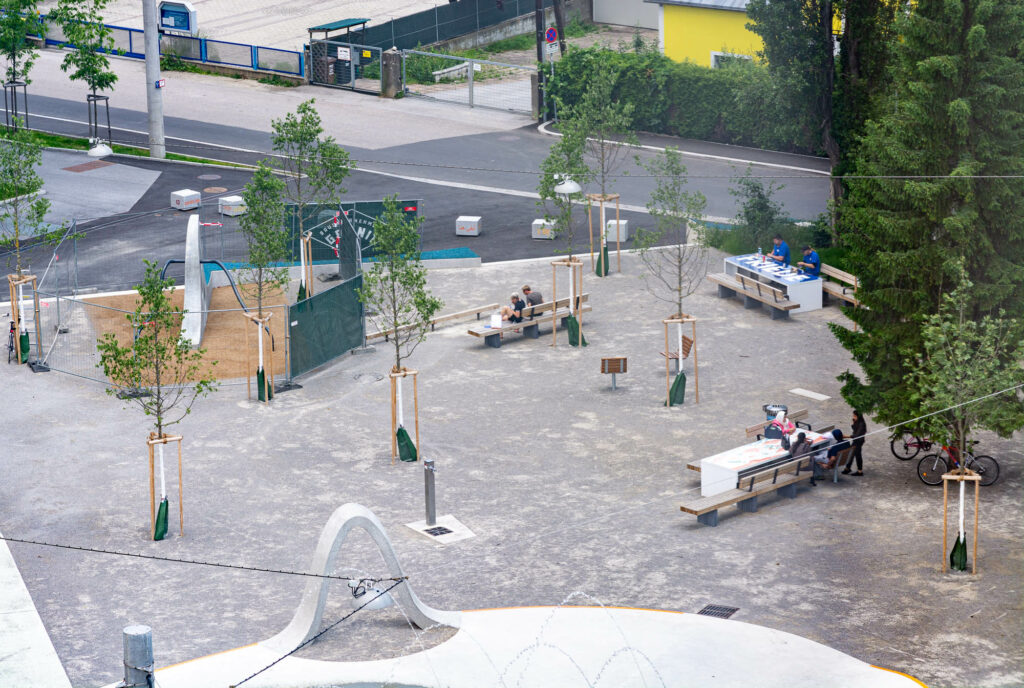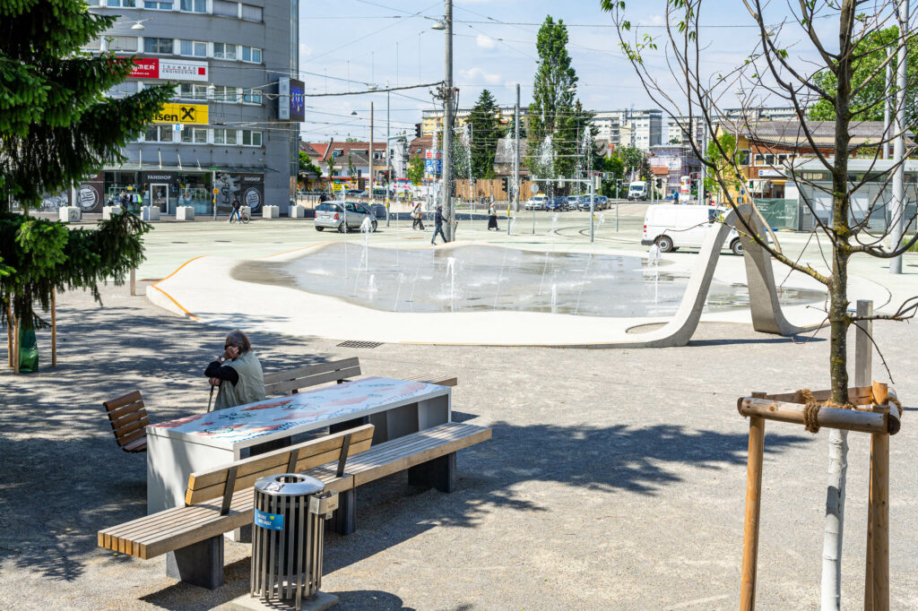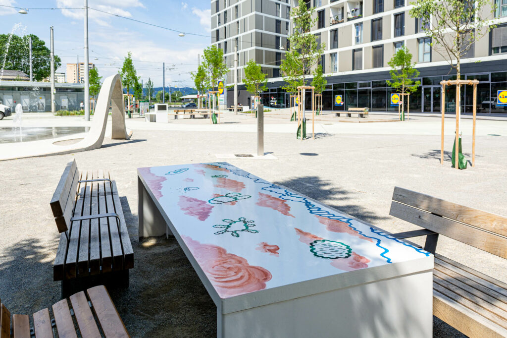 Das Stadtteilzentrum, die Architekturvermittlerin Maria Fanta, die Künstlerin Nicole Pruckermayr und das Kinderbüro – Die Lobby für Menschen bis 14 arbeiten im Vorfeld mit den Kindern. Die Zeichnungen, die sich schlussendlich in den Platz einschreiben, werden von den Kunstschaffenden Johanna Regger, Isa Riedl, Edda Strobl und studio ASYNCHROME gemeinsam mit Kindern der Volksschule Schönau erarbeitet.
