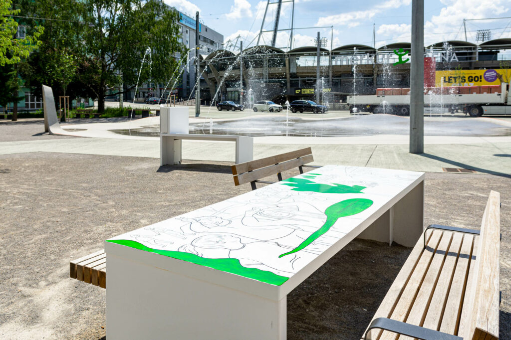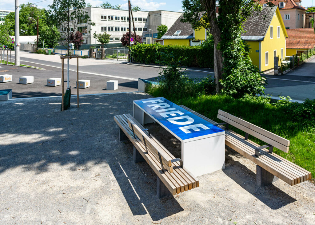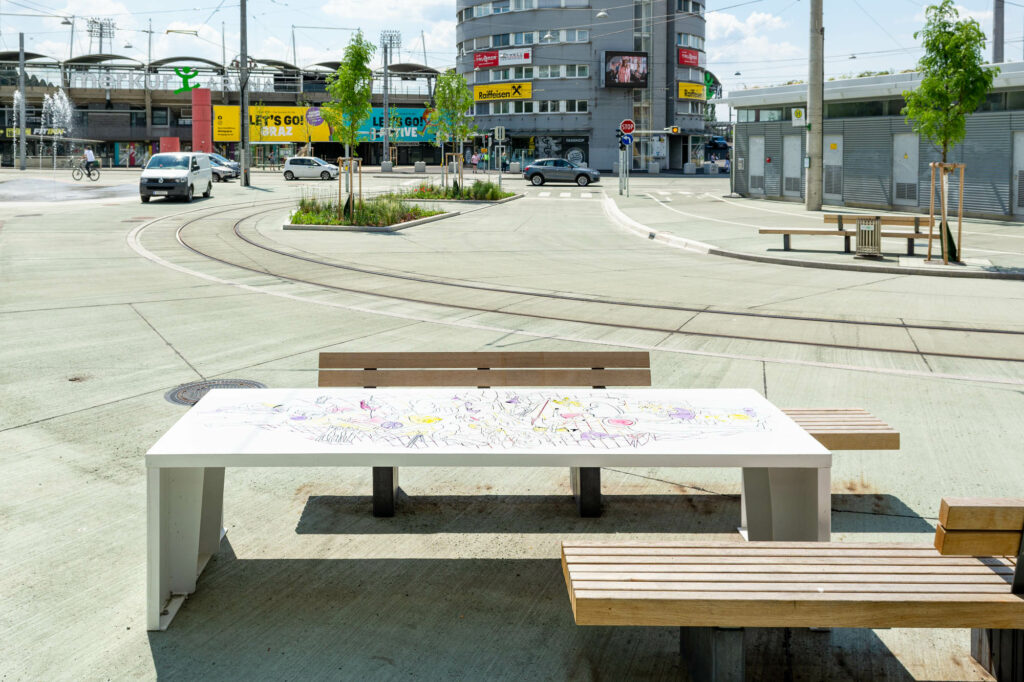 Kinder zwischen 8 und 10 Jahren entwickeln in verschiedenen Workshops mit Künstler_innen, Architekt_innen, Sozialarbeiter_innen und Kinderrechte-Expert_innen großformatige Zeichnungen für den Bertha-von-Suttner-Platz. Der neugestaltete Platz beim Liebenauer Stadion steht thematisch ganz im Zeichen von Frieden. Bertha von Suttner, die erste weibliche Friedensnobelpreisträgerin steht quasi Patin für dieses Projekt, welches den konkreten Stadtraum in seiner Funktion als lebensfreundlichen und friedlichen Freiraum für Anwohner_innen jeglichen Alters im Auge hat. Aufenthalts- und Freizeitorte für Kinder im urbanen Umfeld sind rar und oft segrigiert.